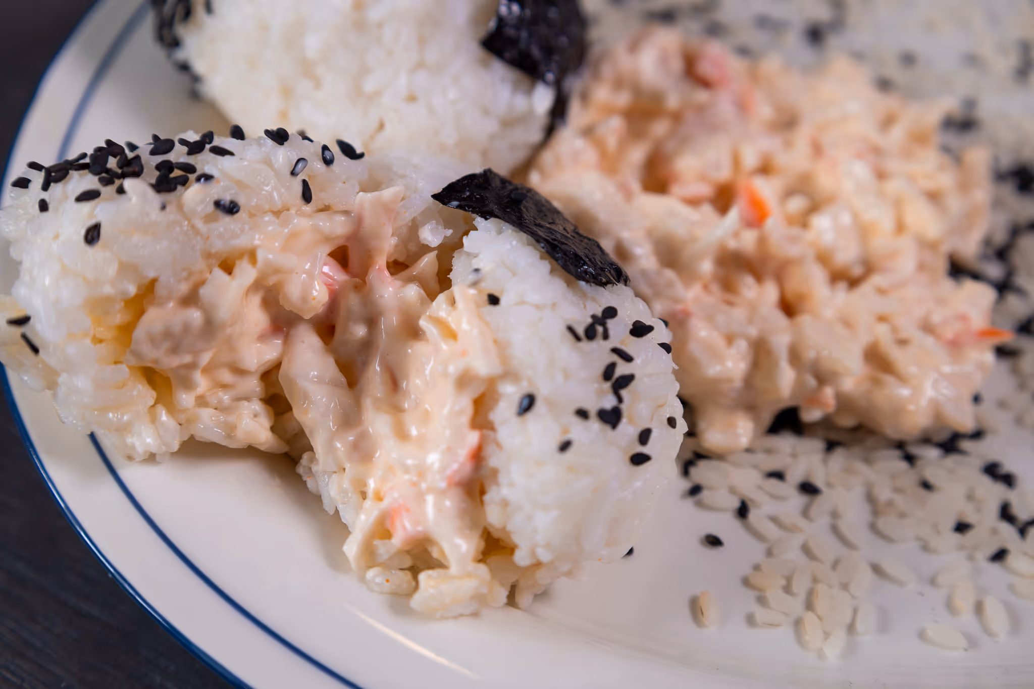 - Wrap bottom of rice ball with seaweed and dip top half in black sesame seeds. Serve chilled.