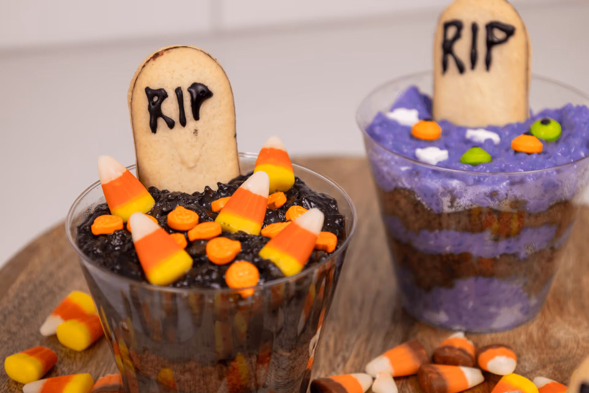 - Decorate: Insert tombstone cookies into each cup. Add gummy worms, pumpkins, or candy eyes for spooky garnish.