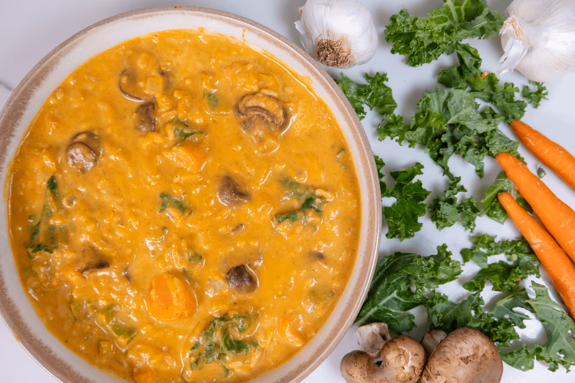 - Stir in coconut milk, kale, season, and serve hot with garnishes.