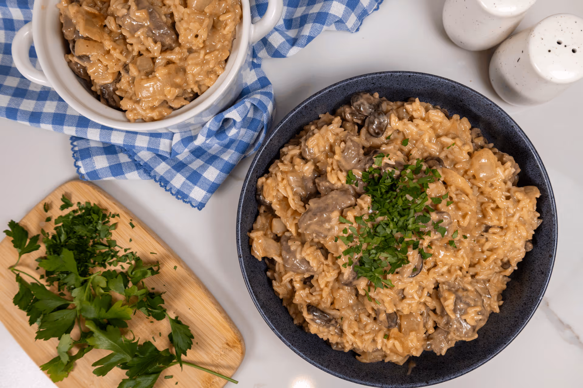 - Stir in rice, broth, Worcestershire, paprika. Return beef.
